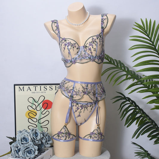 Lavender Floral Embroidery 3-Piece Lingerie Set with Garter Belt