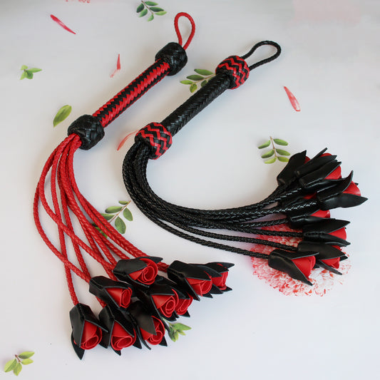 Handmade Red Rose Leather Flogger with 9 Braided Tails