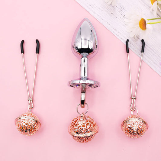 Super Cute Bell Nipple Clamps & Anal Plug 2-Piece Set Gold/Silver