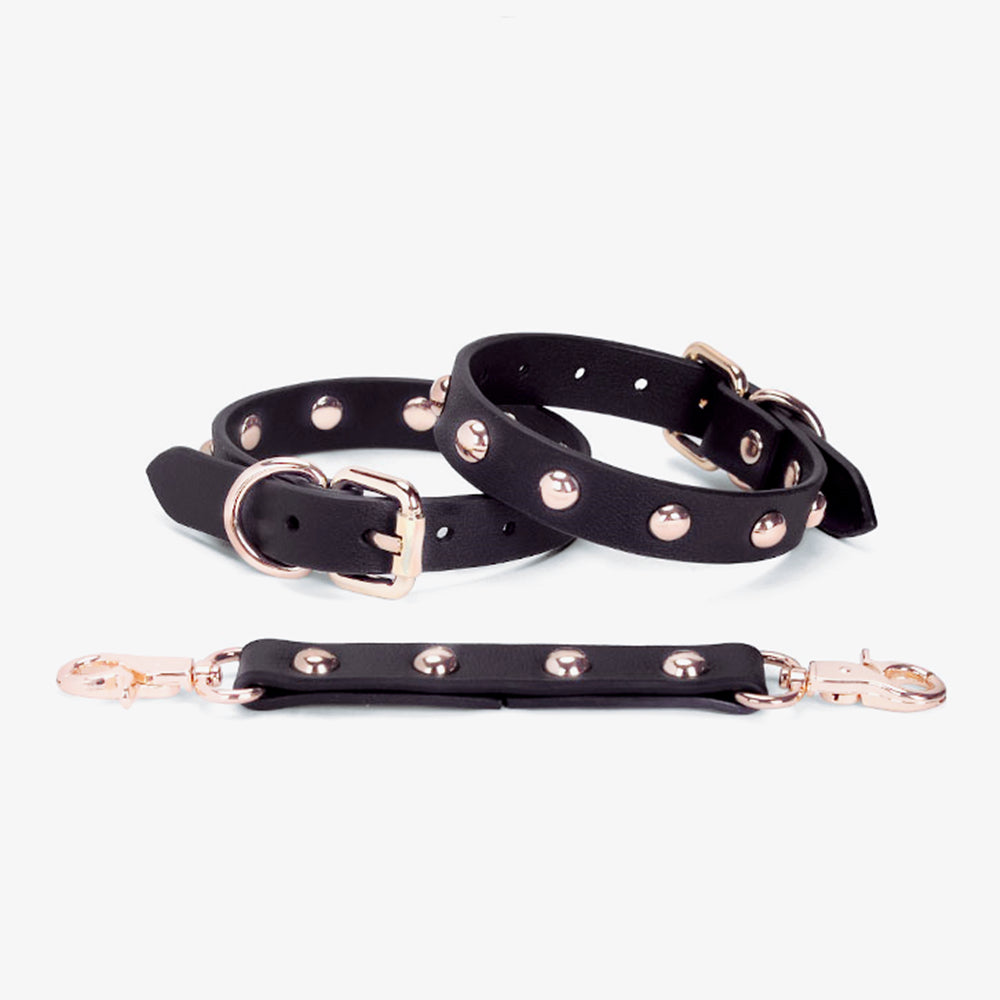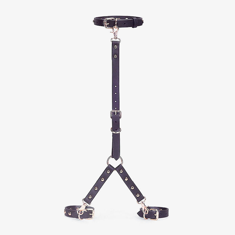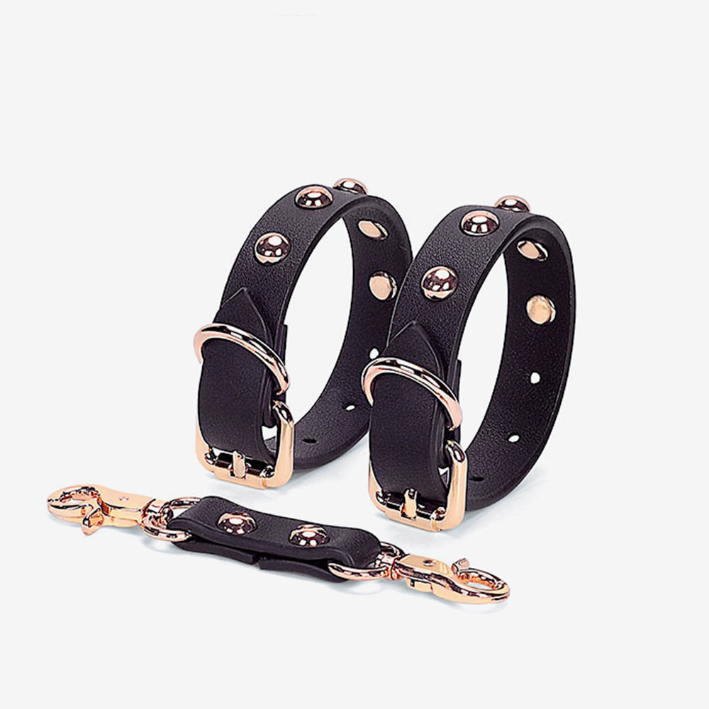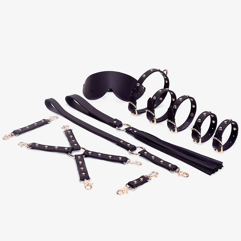 - This set comes complete with wrist, thigh and ankle cuffs, a collar and leash, a blindfold, a flog and so on, which are perfect for restraining your partner.